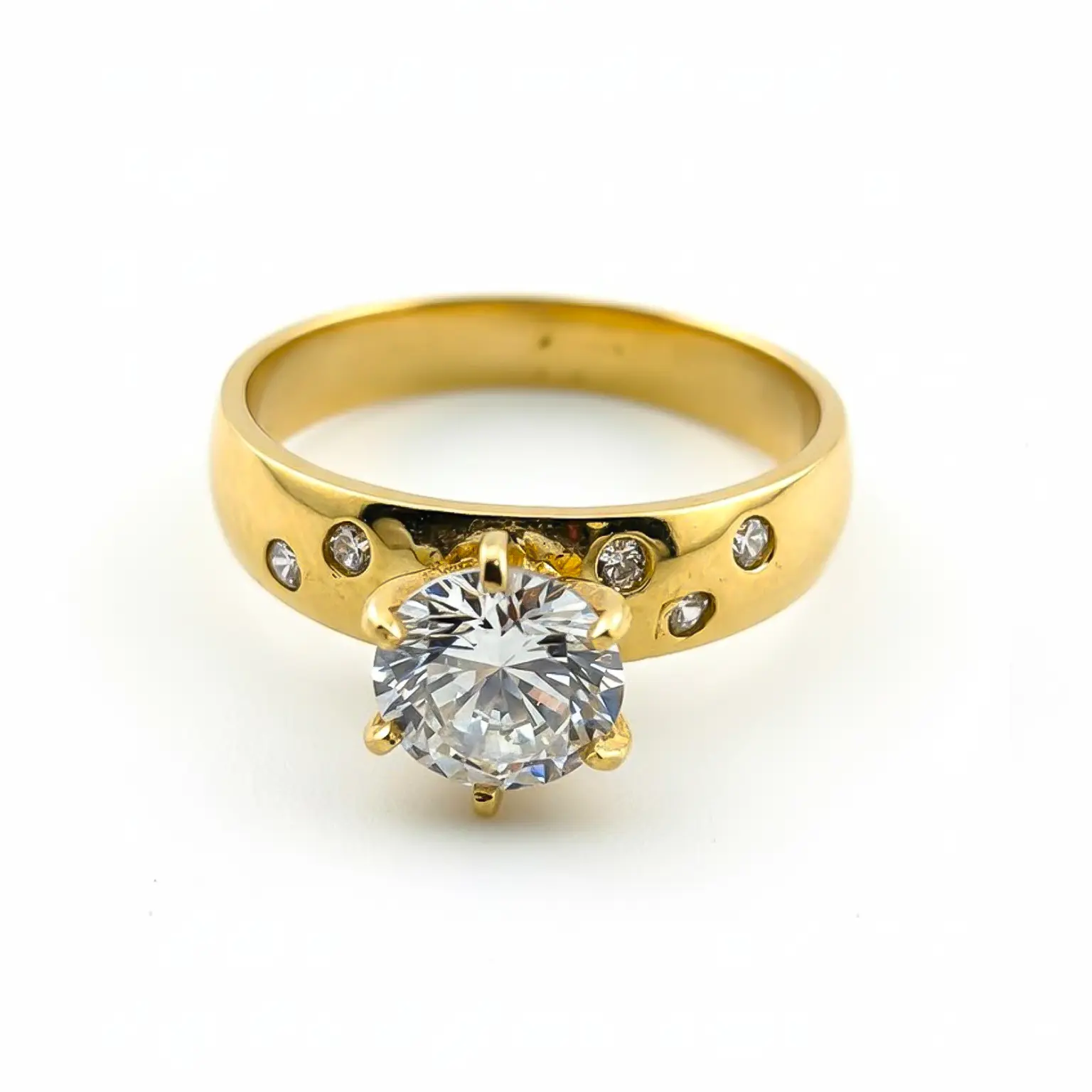 En el centro, una zirconia de corte redondo y gran tamaño se sostiene firmemente con un engaste de seis garras, resaltando su resplandor con cada movimiento. El contraste entre la piedra principal y las incrustaciones laterales crea un equilibrio visual perfecto entre brillo y elegancia.