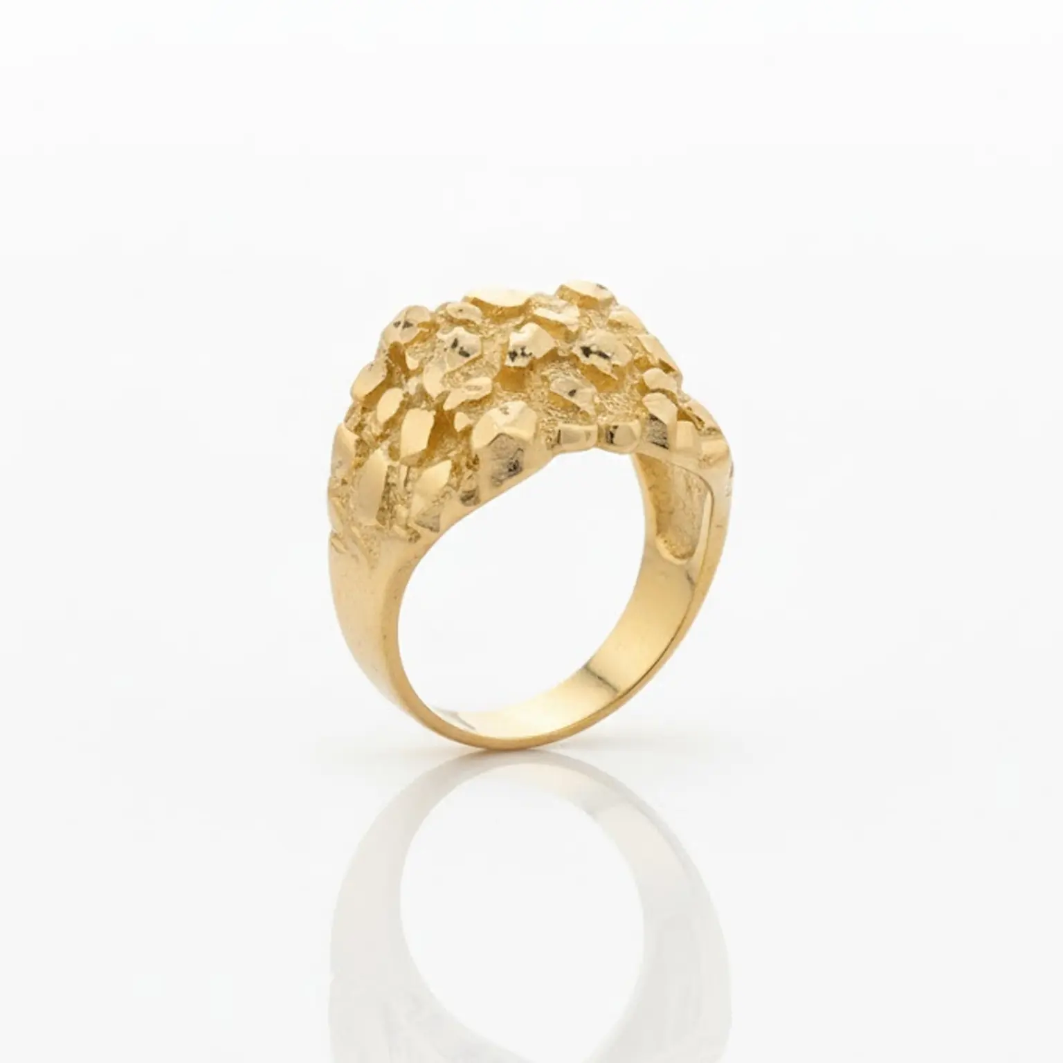 Inspirado en la forma natural de las pepitas de oro, este anillo para caballero presenta un diseño audaz y lleno de carácter. Su textura martillada deja apreciar el acabado orgánico del oro en bruto, logrando una estética robusta y elegante al mismo tiempo.