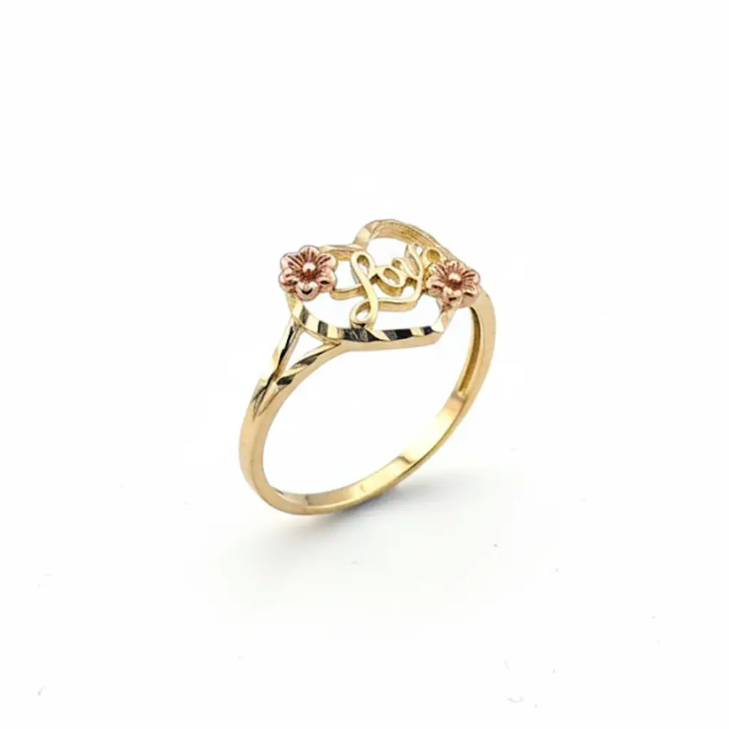 El anillo Love en oro 14k es una pieza llena de encanto y simbolismo. Su diseño presenta la palabra “Love” en elegante caligrafía, enmarcada por dos delicadas flores en tono rosa que resaltan con un toque romántico y sofisticado.