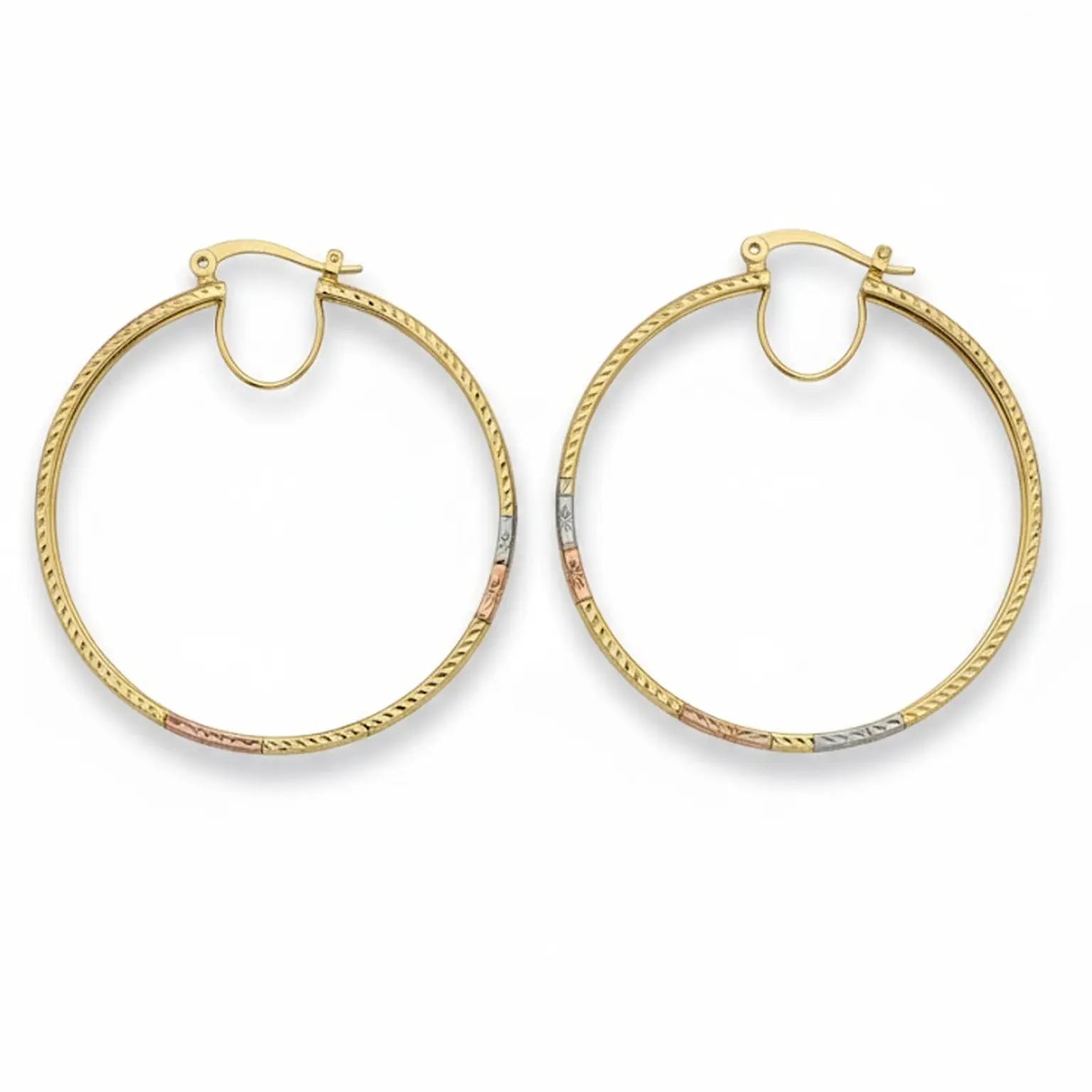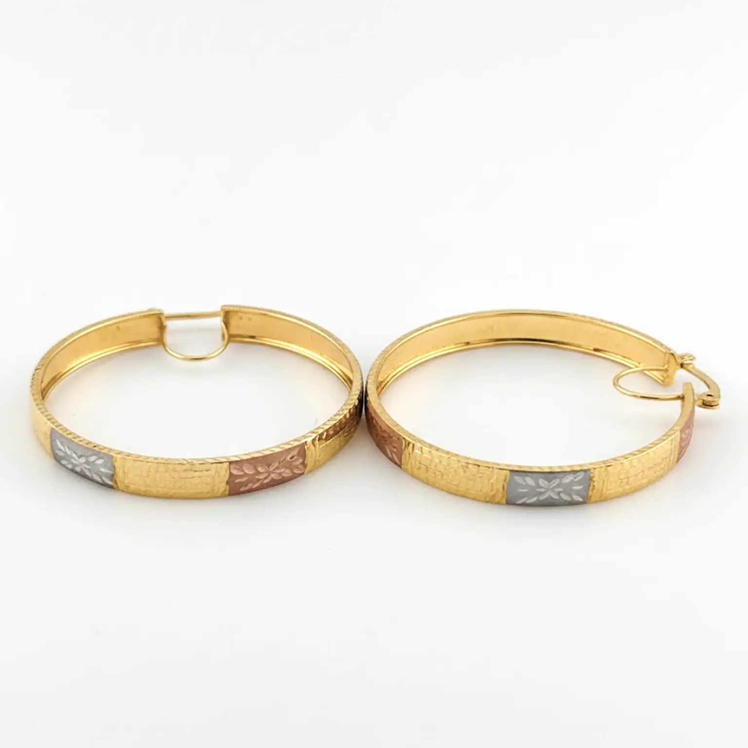 Estos hermosos aretes en oro tricolor están elaborados con oro sólido de 14 quilates y combinan secciones de oro amarillo, rosa y blanco, cada una con un grabado floral delicado que resalta su brillo y textura. Su diseño clásico con borde plano los convierte en una joya atemporal perfecta para uso diario o para eventos especiales.
