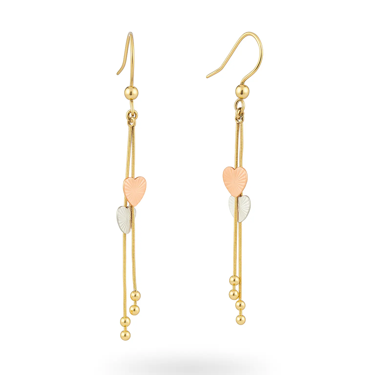 Estos encantadores aretes colgantes en oro tricolor de 14 quilates son una expresión delicada de amor y elegancia. Su diseño incorpora corazones en tonos oro rosa y blanco, sostenidos por delgadas varillas de oro amarillo que terminan con pequeñas esferas doradas, creando un movimiento ligero y armonioso.
