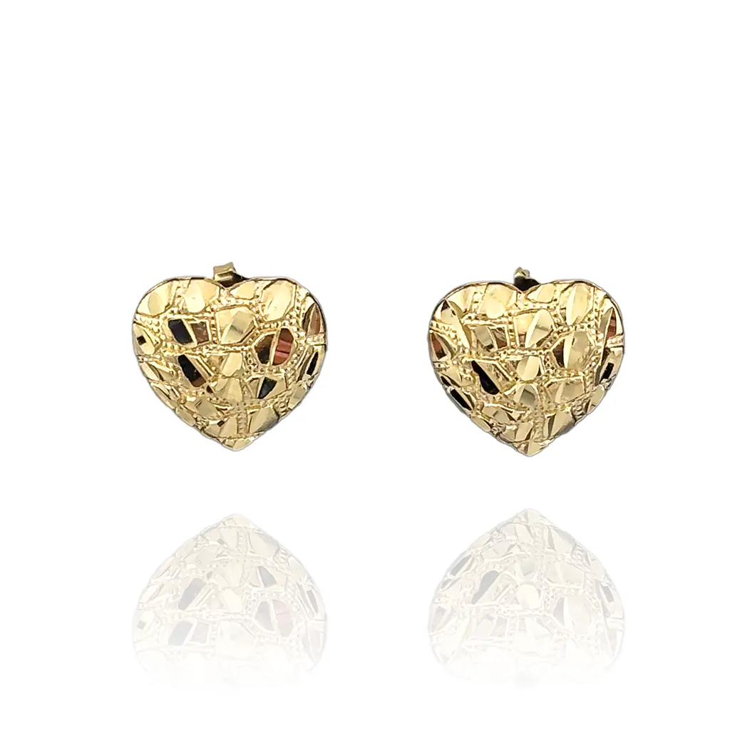 Estos aretes en forma de corazón elaborados en oro sólido de 14 quilates destacan por su textura facetada tipo mosaico, que refleja la luz de forma espectacular desde cualquier ángulo. Su diseño artesanal combina elegancia, brillo y un toque romántico, ideal para uso diario o para complementar un look más sofisticado.