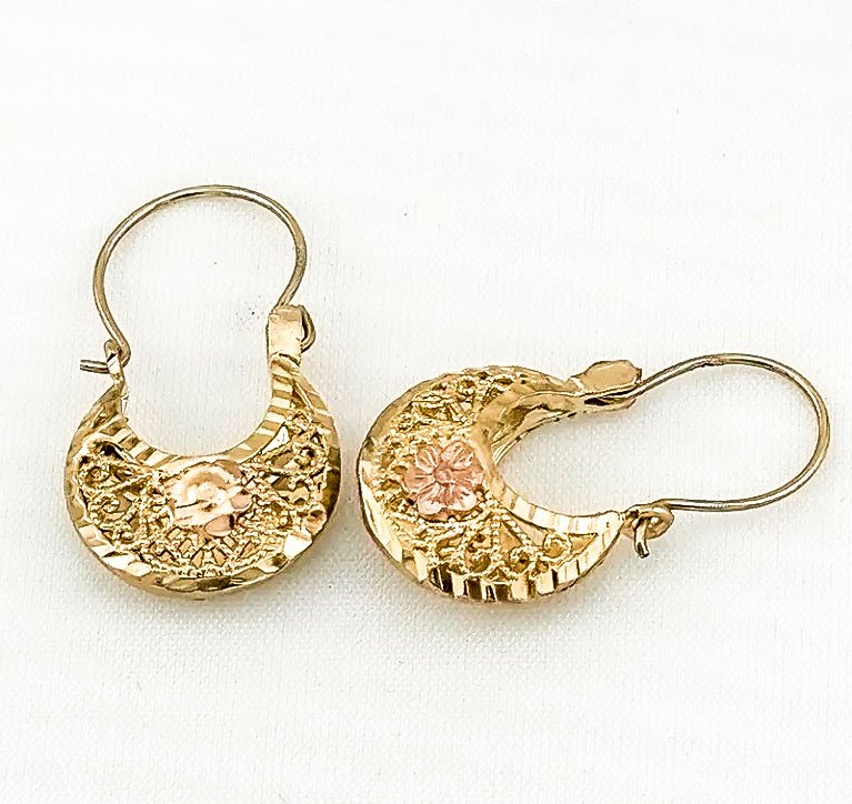 Sé el primero en valorar “Aretes de Media Luna en Oro Sólido de 14K con Flor en Oro Rosado”