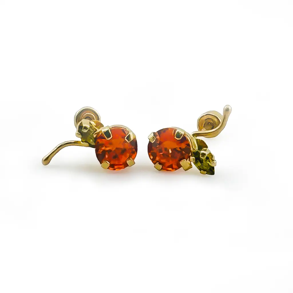 Los aretes mini cereza en oro 14k son una pieza encantadora que combina color, brillo y un toque de fantasía natural. Su diseño inspirado en pequeñas cerezas destaca por las piedras rojas circulares y las hojas verdes finamente talladas, logrando una joya delicada y alegre.