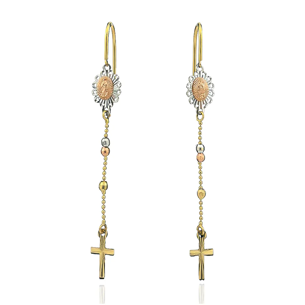 Estos aretes largos bicolor en oro 14k combinan elegancia y devoción en un diseño lleno de detalle. Cada pieza presenta una delicada imagen de la Virgen de Guadalupe enmarcada en un motivo floral, de donde cuelga una fina cadena con esferas de oro amarillo, blanco y rosa, que culmina en una pequeña cruz dorada.