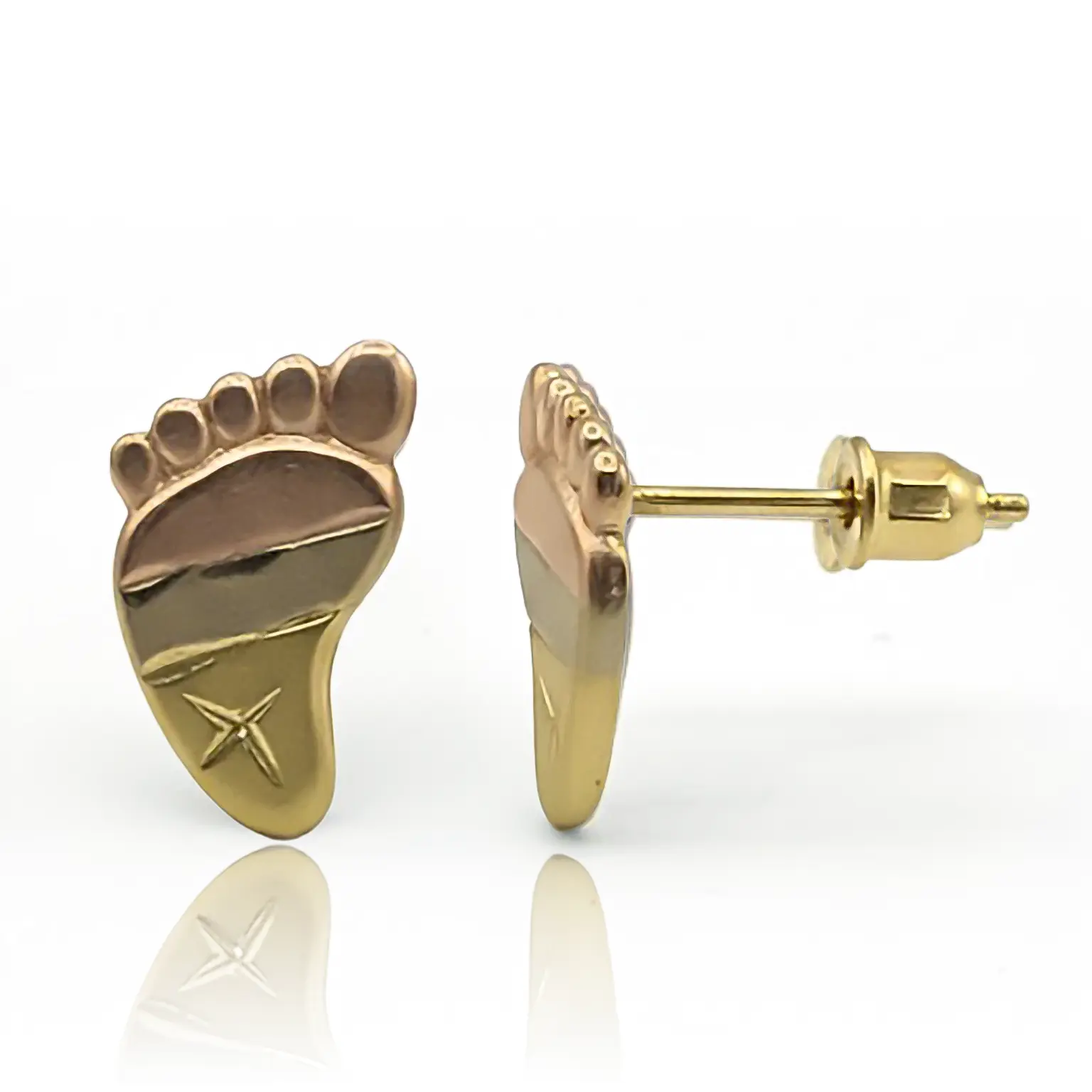 Estos adorables broqueles en forma de pie de bebé están elaborados en oro tricolor de 14 quilates, combinando con delicadeza tonos amarillo, rosa y blanco para crear un acabado único y elegante.
