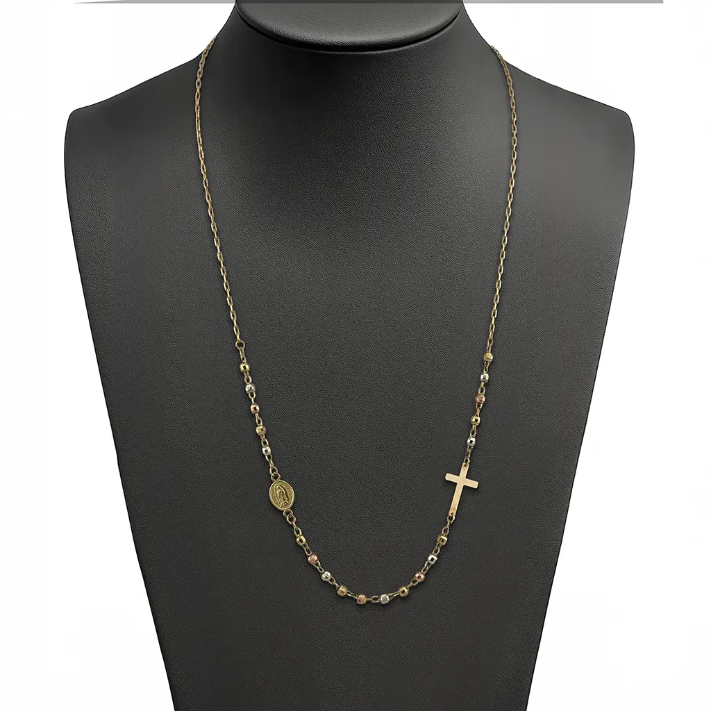 Este hermoso collar rosario en oro 14k es una joya de fe y elegancia. Su diseño moderno incorpora una cruz lateral y una medalla de la Virgen cuidadosamente detallada, que añaden un toque espiritual y sofisticado al mismo tiempo.