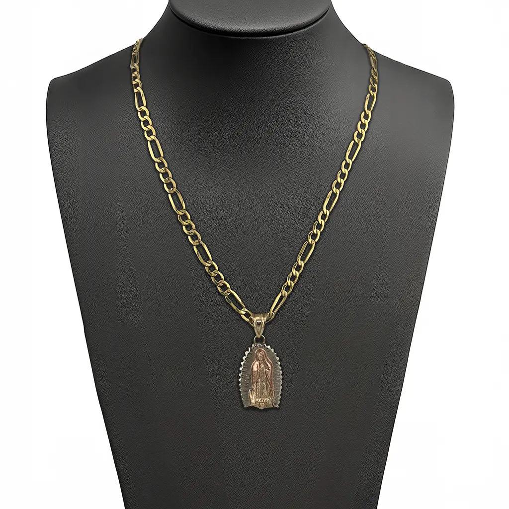 Este collar con dije de la Virgen de Guadalupe en oro 14k es una joya llena de fe, tradición y elegancia. Su diseño clásico resalta la figura de la Virgen con un acabado en tres tonos de oro, cuidadosamente tallado para reflejar cada detalle del manto y el aura de luz que la rodea.