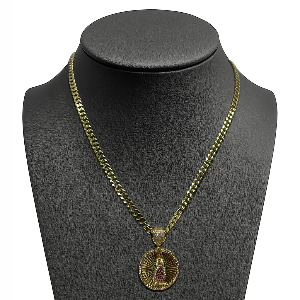 Este collar con medalla de la Virgen de Guadalupe en oro 14k representa fe, protección y estilo. Su diseño presenta una figura detallada de la Virgen en relieve, con delicados acentos de color que resaltan su manto y su figura sagrada, rodeada por un fondo texturizado con destellos radiales que evocan luz divina.