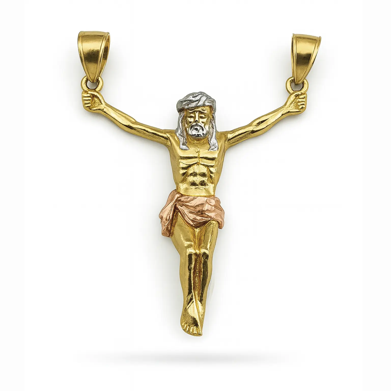 El uso de los tres tonos de oro —amarillo, blanco y rosa— resalta los detalles anatómicos y aporta un contraste elegante que lo convierte en una joya única. Los dos enganches en la parte superior permiten que el dije caiga firme y centrado, ideal para cadenas resistentes que deseen portar esta imagen con fuerza y fe.