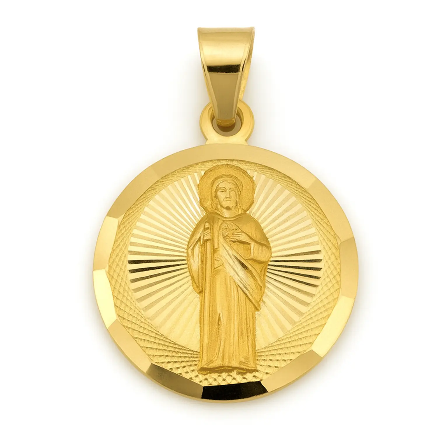 Este dije redondo representa a San Judas Tadeo, santo patrono de las causas difíciles y urgentes. Fabricado con acabado dorado brillante, presenta la figura del santo en relieve al centro, rodeada de un fondo con rayos grabados que simbolizan luz divina y esperanza.