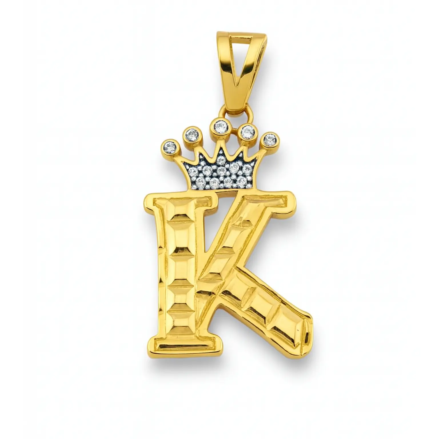 El dije con letra K y corona en oro 14k es una joya que transmite elegancia, fuerza y distinción. Cada detalle está cuidadosamente elaborado para reflejar la personalidad de quien lo lleva: segura, sofisticada y con un toque de realeza. La letra K, trabajada con acabado diamantado, brilla intensamente al reflejar la luz, mientras que la corona con circonias añade un resplandor sutil que realza su belleza.
