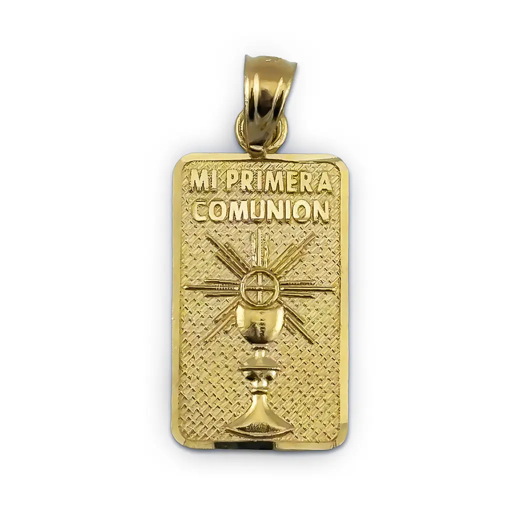 Celebra un momento espiritual inolvidable con este hermoso dije “Mi Primera Comunión” elaborado en oro sólido de 14 quilates. Su diseño rectangular presenta en relieve un cáliz con la hostia sagrada y rayos de luz, símbolo de fe, pureza y devoción.
