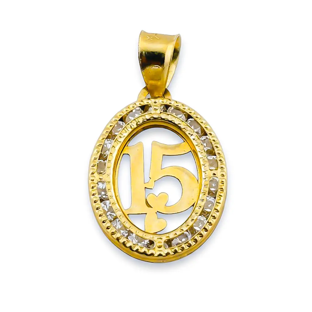 El dije número 15 con zirconias en oro 14k es una joya diseñada para celebrar uno de los momentos más importantes en la vida: los quince años. Su diseño ovalado con el número “15” al centro simboliza juventud, esperanza y nuevos comienzos, mientras que su marco decorado con zirconias realza el brillo y la elegancia de esta pieza.