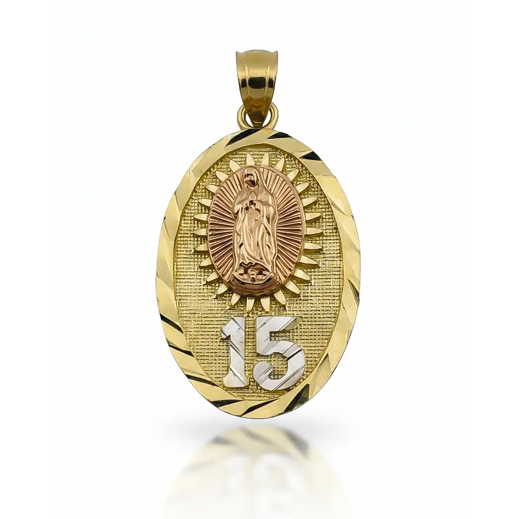 El dije de la Virgen de Guadalupe con número 15 en oro tricolor 14k es una joya llena de fe, amor y simbolismo, creada especialmente para celebrar un momento único: los quince años. Su diseño ovalado combina la imagen de la Virgen en oro rosa, el número 15 en oro blanco y un fondo texturizado en oro amarillo, resaltando con brillo artesanal cada detalle.