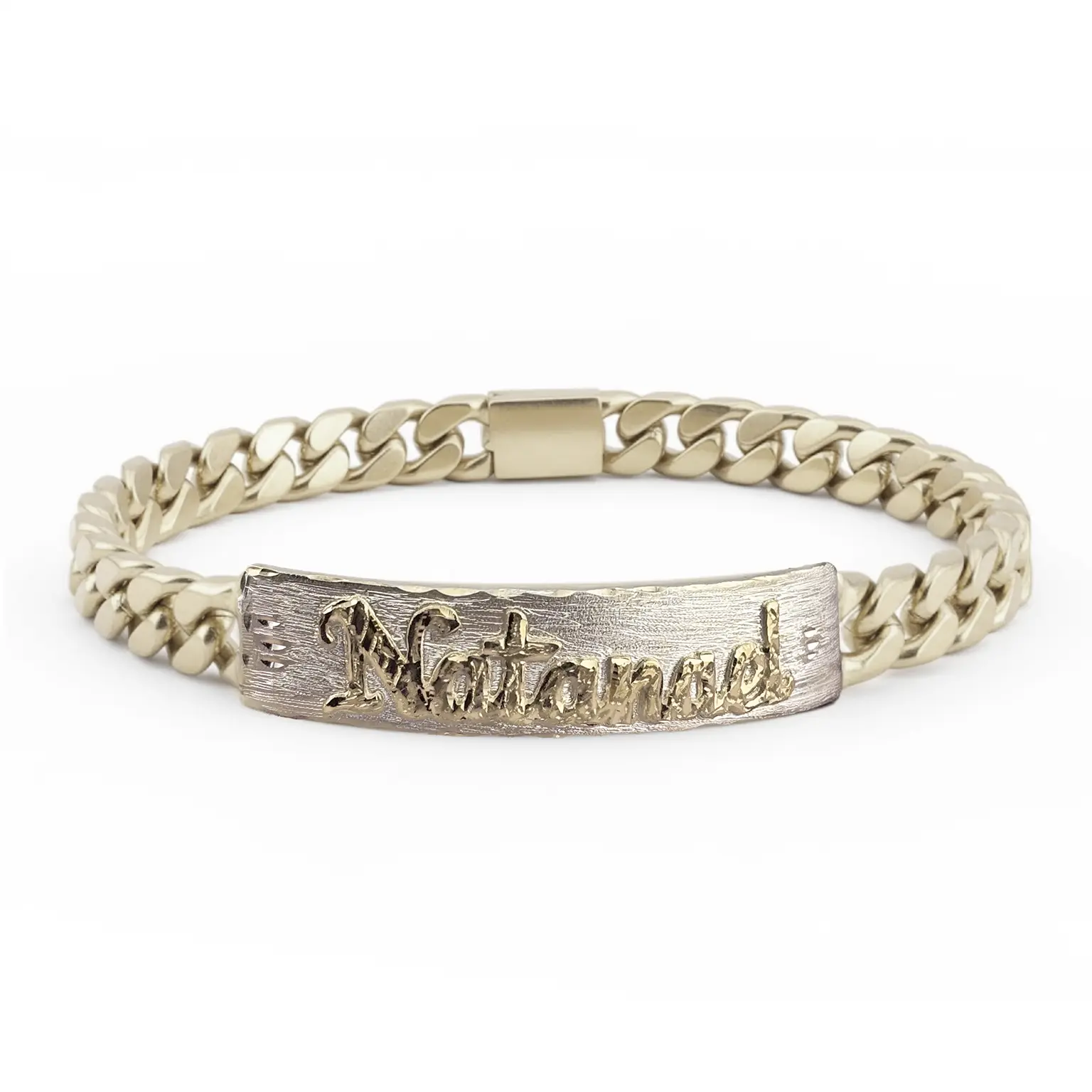 Lleva la identidad con orgullo con esta esclava personalizada en oro 14k con el nombre Natanael. Su diseño robusto y elegante combina una placa satinada con letras en alto relieve y un terminado bicolor que resalta la autenticidad del trabajo artesanal.