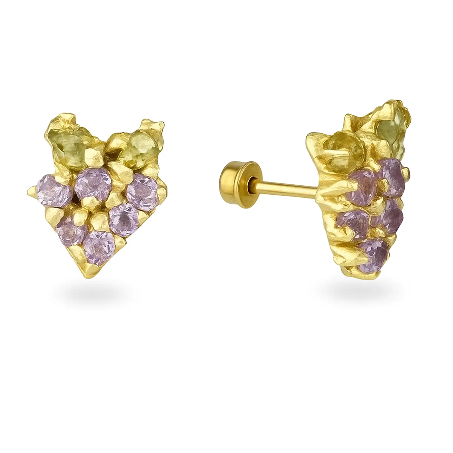 Estos mini aretes de oro combinan un diseño artesanal con un toque moderno y sofisticado. Su estructura irregular en oro realza el brillo de las piedras en tonos lila y ambar, creando un contraste delicado y elegante que resalta la belleza natural de quien los porta.