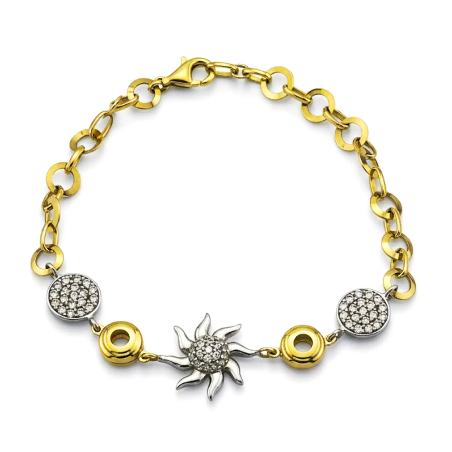 Esta pulsera de oro 14k es una pieza radiante e inspiradora, diseñada con eslabones circulares estilizados y un juego de dijes centrales que capturan la luz y el simbolismo. El protagonista de esta joya es un dije en forma de sol, elaborado con textura orgánica en oro blanco, decorado con circonias estilo pavé que aportan brillo en cada movimiento.
