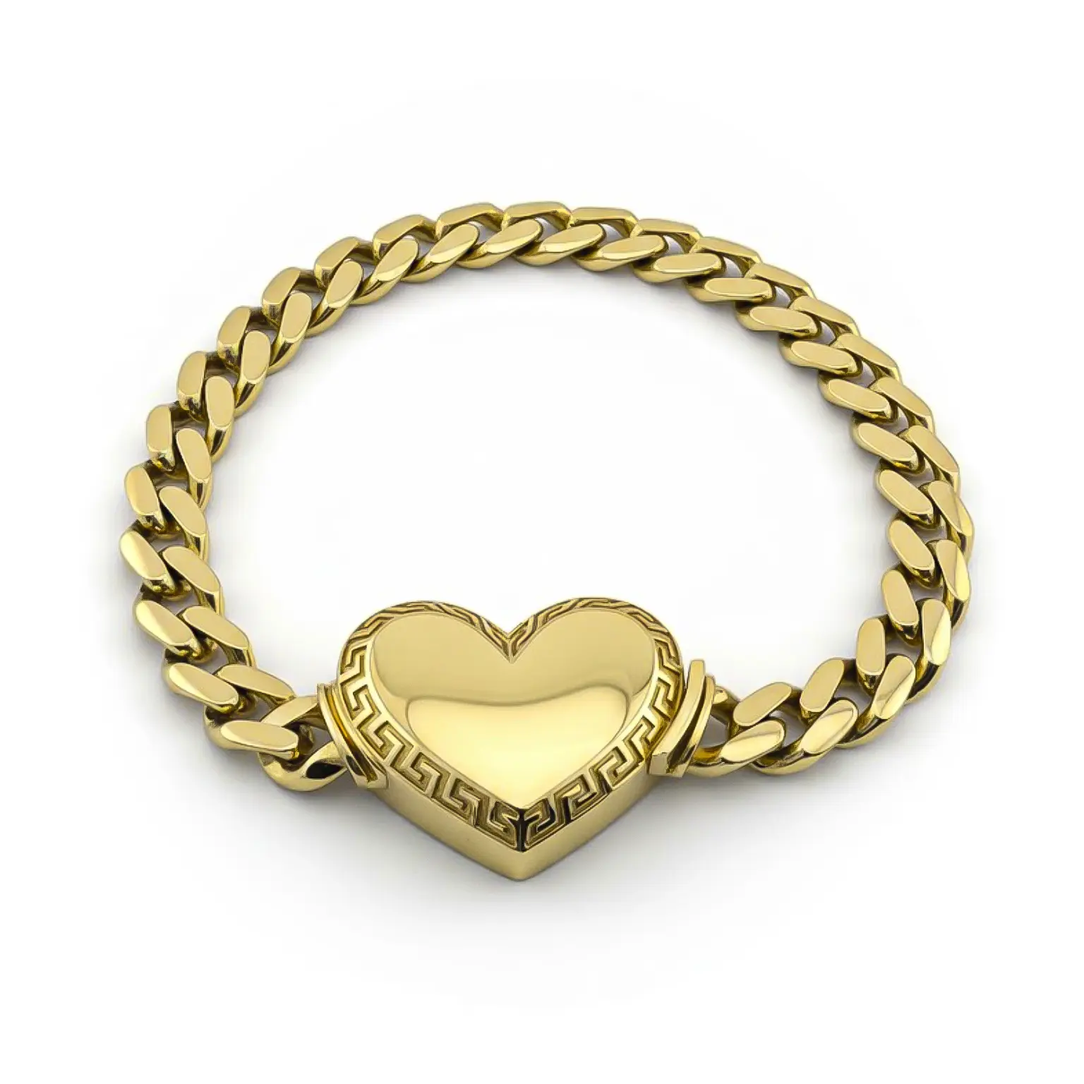 Al centro, resalta un dije en forma de corazón sólido, con detalles grabados en patrón tipo greca que bordean suavemente el contorno del corazón, evocando inspiración clásica y lujo. Este detalle decorativo aporta un estilo ornamental que equilibra la fuerza del diseño con un toque romántico.